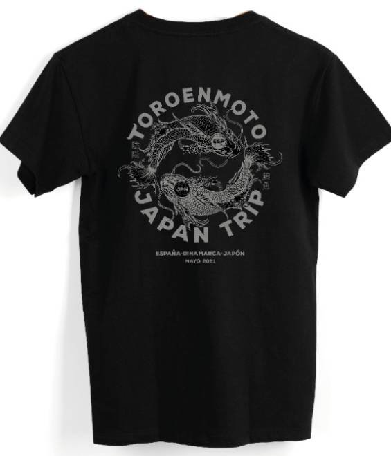 Camiseta negra 100% algodón con diseño Japan Trip. Logo ToroEnMoto en el pecho y Koi no Michi (鯉の道) en la espalda. Serigrafía ECO. Edición limitada.